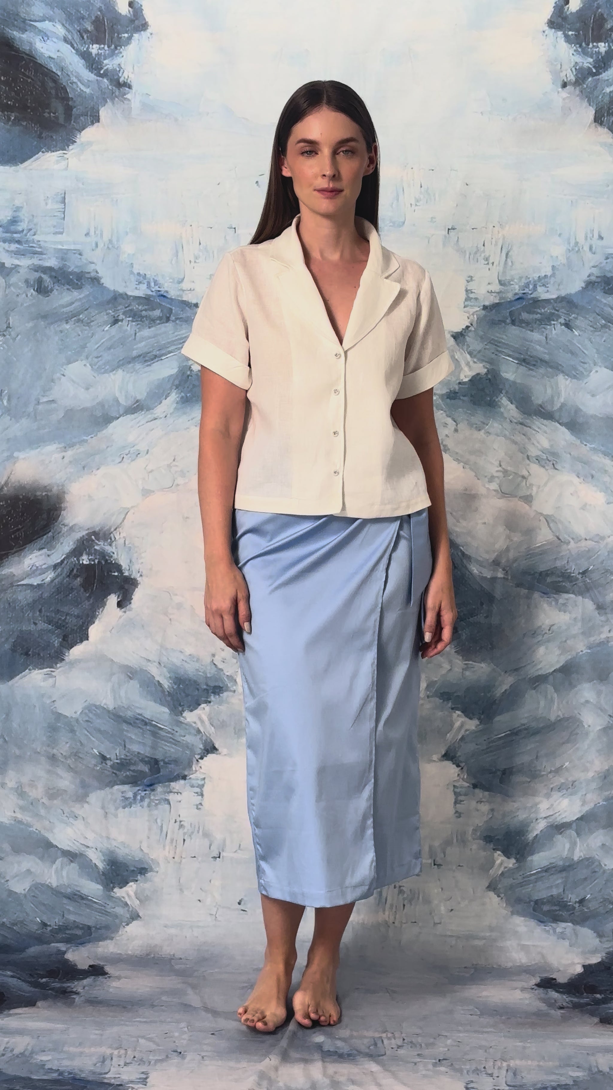 Falda envolvente tipo pareo en algodón satinado color azul, con ribete azul oscuro y largo midi.